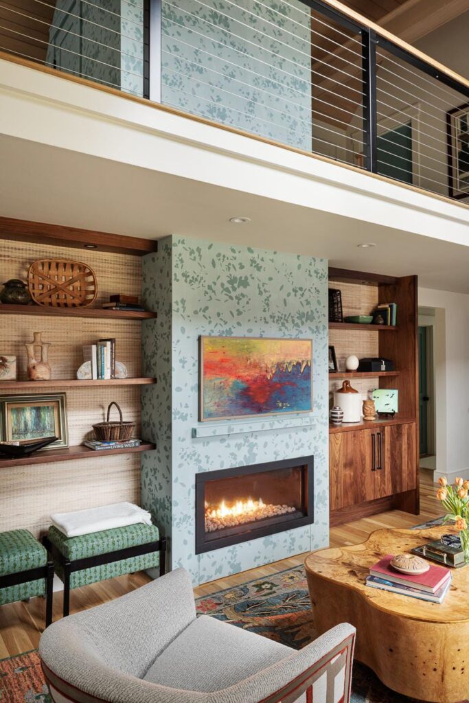 The defining moment of the project is the vaulted living room. Within the existing Cape shell, the team reengineered the roof structure to introduce vertical volume, an overhead dormer, and a second-story balcony. Large windows now frame the pond and forest beyond, filling the space with natural light and forging a direct visual connection to the outdoors. A two-story fireplace finished in Venetian plaster anchors the room, and natural woods—maple, oak and walnut—run through the cabinetry, shelving, and floors, reinforcing the continuity between interior and landscape.