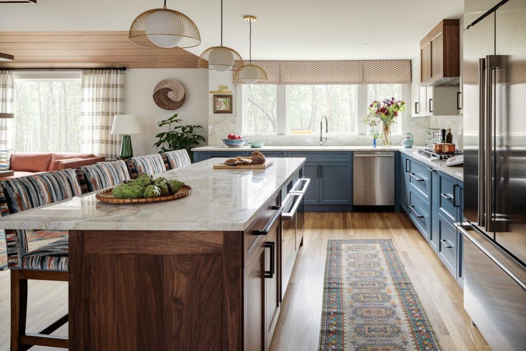 Taking better advantage of the views of the pond and natural surroundings, focusing on her love of baking with an expanded kitchen (with two ovens in the kitchen island), reconfiguring the space with a more open floor plan and plenty of storage and display shelves to showcase the artifacts and art she picks up on her travels. She now has a completed space for entertaining and sharing time with her family and loved ones.